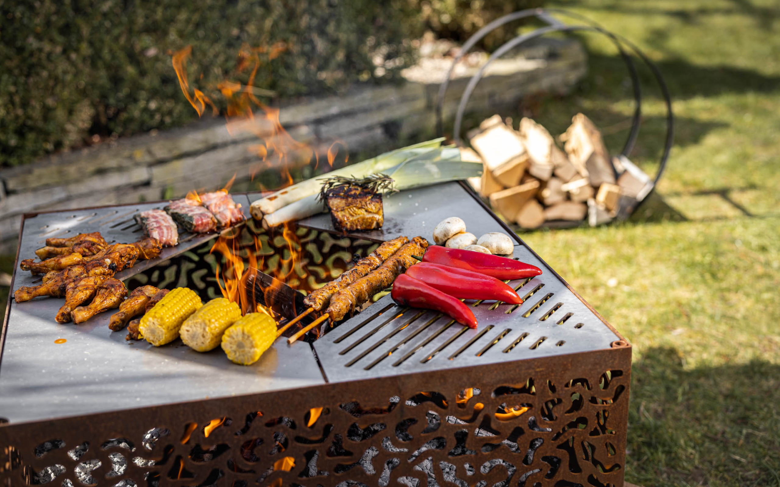 Der Carre 750 in trendiger Rostoptik ist eine Feuerschale, die mit ihrem wunderschönen Muster jeden Abend zu einem einzigartigen Erlebnis macht. Seine Kombination aus Feuerstelle und Grillfunktion macht ihn besonders beliebt. Die massiven und vierteiligen Edelstahlplatten überzeugen durch Qualität, sodass der Carre 750 jedem Grill Konkurrenz macht. Als zusätzliches Plus verfügt die Feuerschale über eine passende metallische Abdeckung, die vor Nässe, Staub schützt und das rustikale Gesamtbild bewahrt.