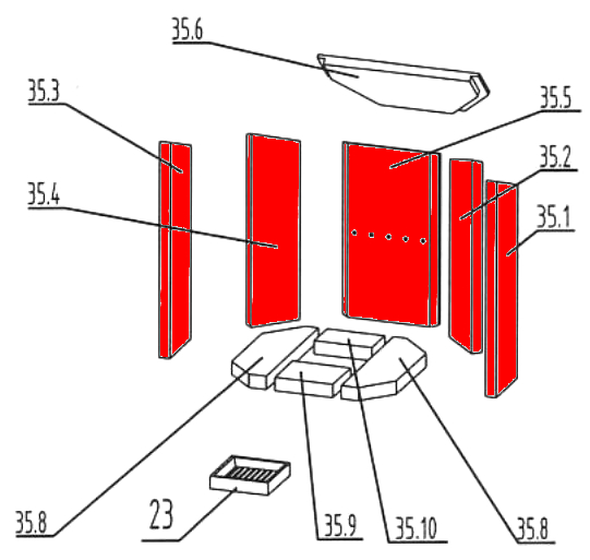 - markantes Merkmal der dazugehörigen Ausmauerung ist der Bodenstein vorne (135x45x30 mm) in Kombination mit dem Bodenstein links (90x249/115x30 mm) und der Zugumlenkung (180/352x148x25 mm)
