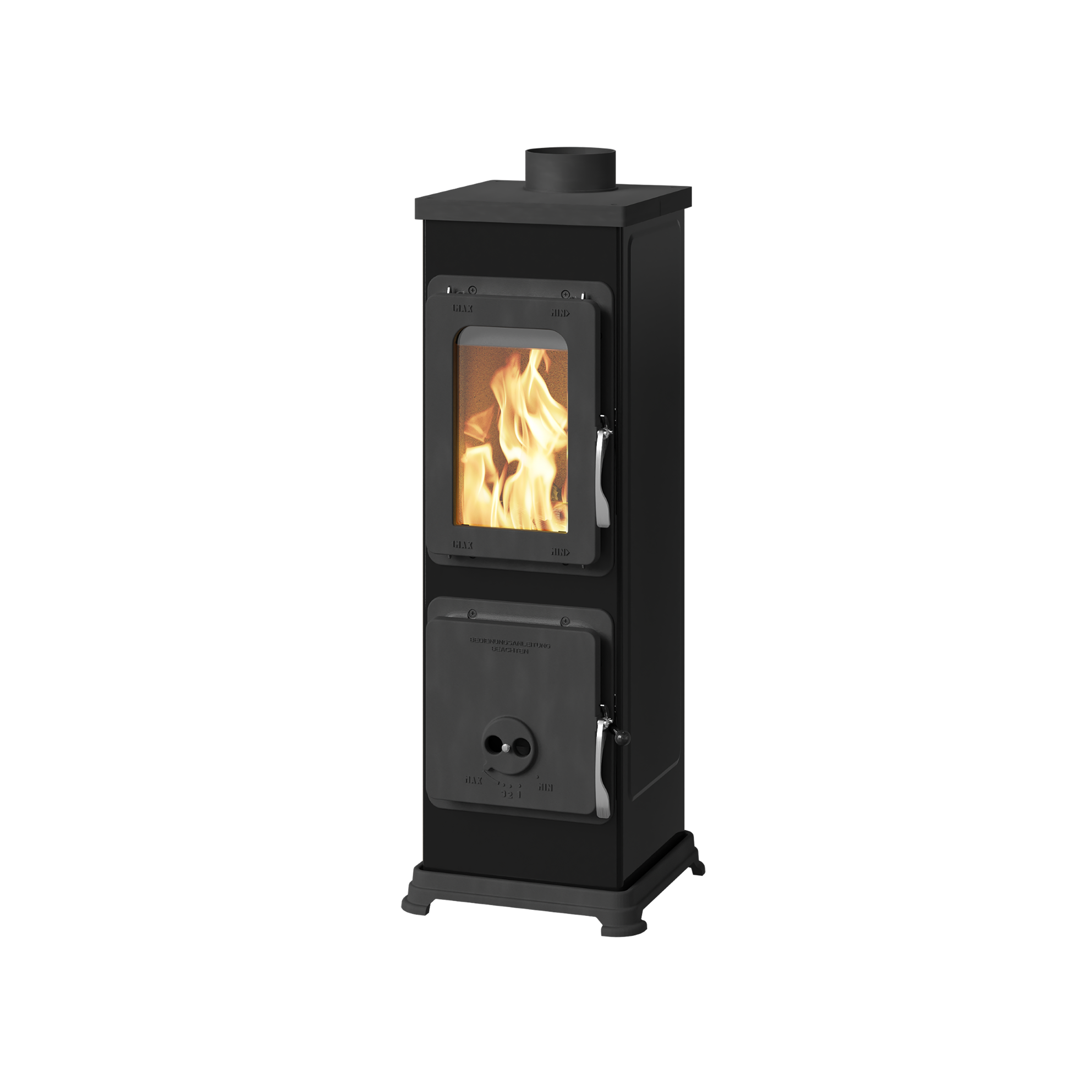 Der Kaminofen Bozen B Top begeistert durch seine schlanke, rechteckige Form und die Sichtscheibe aus Sicherheitsglas, die einen ungestörten Blick auf das Flammenspiel ermöglicht. Das stabile Stahlgehäuse in Schwarz oder Cappuccino passt harmonisch in jedes Wohnambiente und schafft eine warme, elegante Atmosphäre.